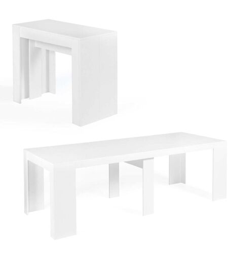 Siete alla ricerca di un mobile ultra-funzionale, multiuso e di tendenza per completare l'arredamento esistente e aggiungere un tocco di design alla vostra casa? La consolle allungabile ORLANDO in legno bianco soddisferà tutte le vostre esigenze! Nella sua versione allungata, potrete far sedere fino a 10 persone intorno a questo tavolo da pranzo conviviale di 235x90 cm! Una volta ripiegato, questo tavolo consolle 90x45 cm può essere utilizzato come mobile d'ingresso per riporre lattine di bevande, oggetti decorativi o piccole piante. Le sue linee massicce daranno carattere al vostro ingresso. Pratico e salvaspazio per eccellenza, potrete passare facilmente da una funzione all'altra grazie alle sue 4 prolunghe, ciascuna lunga 47 cm. La solida struttura in truciolato di 1,5 cm di spessore gli conferisce stabilità e robustezza. Godetevi le cene con la famiglia e gli amici senza ingombrare la casa con questa consolle allungabile ORLANDO in legno bianco! Dimensioni della consolle ...