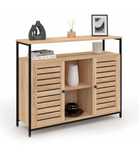 Cercate una credenza originale e funzionale? Non cercate oltre: questa credenza a 2 ante in legno e metallo HALIFAX sarà il pezzo forte del vostro salotto! Aggiungerà un tocco di stile al vostro arredamento con il suo look a due materiali e le sue ante a persiana. La combinazione di legno e metallo le conferisce un aspetto caldo e industriale. Il design delle ante a persiana crea un tocco di carattere ultra-trendy! Questa credenza in legno multifunzionale può essere adattata alla stanza di vostra scelta: può essere utilizzata come credenza per le stoviglie, come libreria per tutti i libri o anche come contenitore per la biancheria della casa o per la scrivania. Come potete vedere, trova posto in qualsiasi stanza della vostra casa e soddisfa tutte le vostre esigenze! Il solido telaio in metallo (1,6x1,6 cm) e la struttura in truciolato (1,5 cm) garantiscono la stabilità della credenza. Con questa credenza bassa non dovrete preoccuparvi di avere oggetti in giro: c'è un posto per tutto. ...