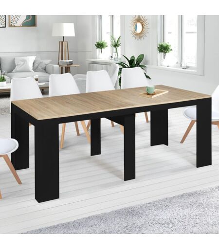 Siete alla ricerca di un mobile ultra-funzionale, multiuso e di tendenza per completare l'arredamento esistente e aggiungere un tocco di design alla vostra casa? Il tavolo consolle allungabile ORLANDO in legno nero e impiallacciato faggio soddisferà tutte le vostre esigenze! Nella sua versione allungata, questo tavolo da pranzo può ospitare fino a 10 persone, grazie alle sue generose dimensioni di 235 cm x 90 cm! Una volta piegato, potete utilizzare questa consolle compatta da 90 cm x 47 cm come mobile d'ingresso per riporre contenitori, oggetti decorativi o piccole piante. Le sue linee semplici e pulite daranno carattere al vostro ingresso. Pratico e salvaspazio per eccellenza, può passare facilmente da una funzione all'altra grazie alle sue 4 prolunghe, ciascuna lunga 47 cm, per sfruttare al meglio lo spazio della vostra stanza! Inoltre, la sua solida struttura in truciolato di 1,5 cm di spessore gli conferisce stabilità e robustezza. Godetevi le cene con la famiglia e gli amici ...