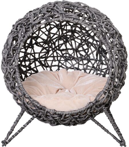 Pawhut Cestino gatto letto rialzato gatto accogliente grotta a gatto grande comfort dim. Ø 52 x 58H cm cuscino soffice incluso resina intrecciata effetto rattan grigio