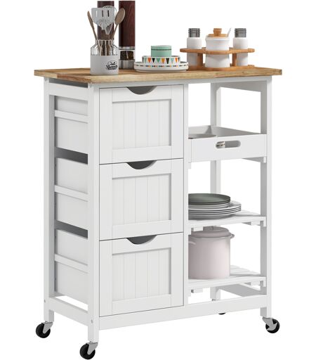 Homcom Carrello da cucina con ruote piano di lavoro in legno 3 cassetti + 1 piano removibile 67 x 37 x 85,5 cm bianco