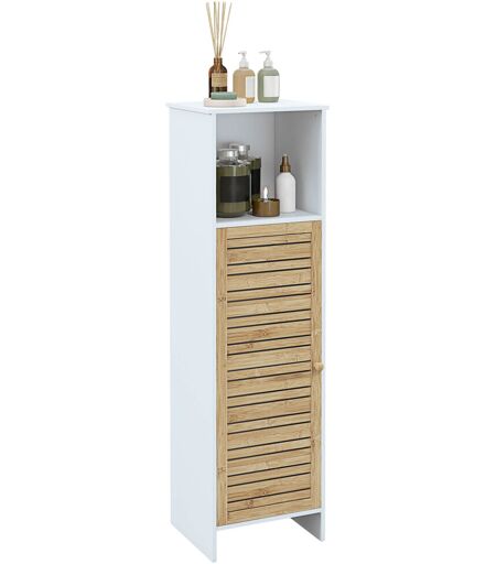 Ottimizza lo spazio con il mobile HOMCOM, dotato di un vano aperto e di una superficie piana. L'armadio da bagno con mensola regolabile su tre livelli organizza i tuoi essenziali. La porta a persiane garantisce la ventilazione. Design in MDF bianco e bamboo, finitura dipinta elegante. ...