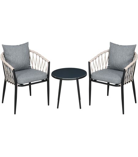 Outsunny Salon de jardin 2 persone 3 pezzi 2 poltrone con cuscini tavolino rotondo piano in vetro temperato corda intrecciata grigio