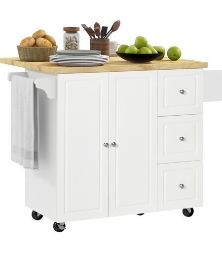 Homcom Isola da cucina con piano di lavoro ribaltabile 3 cassetti 1 armadio portasciugamani e porta-spezie 111,5 x 75 x 89 cm bianco