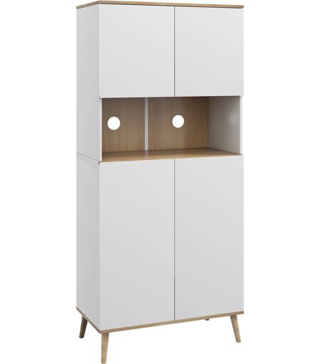 Questo mobile da cucina offre sia funzionalità che eleganza! Con 2 armadi dotati di mensole regolabili in altezza e un'ampia nicchia centrale, avrai a disposizione molto spazio di archiviazione. Il suo design Scandinavo con linee minimaliste e il mix di bianco e legno naturale aggiungeranno un tocco speciale a qualsiasi ambiente interno a scelta: salotto, camera da letto, ufficio, cucina. ...