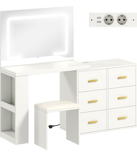 Ottimizza la tua routine con il tavolo da toeletta HOMCOM. Specchio LED regolabile per un trucco perfetto, presa di corrente per dispositivi, sei cassetti e due scomparti per un'organizzazione ottimale. Include uno sgabello confortevole con imbottitura in schiuma e rivestimento sintetico. ...
