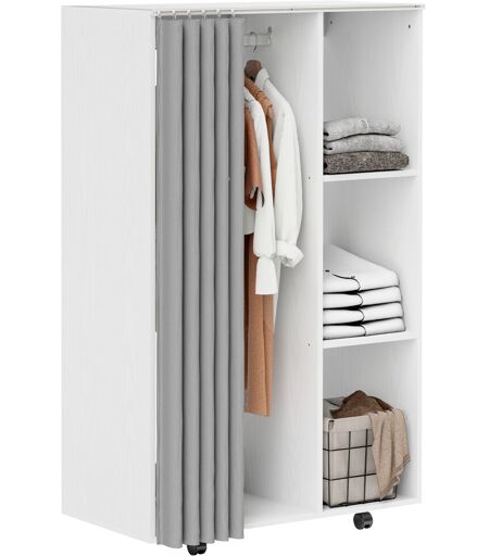 Esplora l'eleganza dell'armadio guardaroba HOMCOM con ruote scorrevoli e tende protettive. Dotata di tre scomparti aperti e barre per appendere i vestiti, è perfetta per un'organizzazione efficiente e stilosa dei tuoi abiti. ...