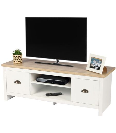 MEUBLORAMA - Mobile tv design coloniale - 120x39,5xH42,5 cm, 2 cassetti e 2 vani, colore bianco e piano in rovere chiaro - Collezione madera
