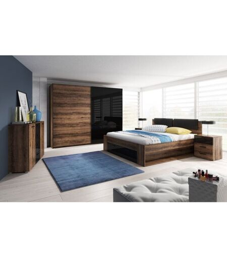 MEUBLORAMA Camera da letto FLOYD: Armadio 200cm, Letto 140x200, cassettiera, comodini. Colore rovere scuro e nero lucido.