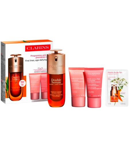 Il Double Serum, con la sua potente formula bifasica, combina 22 estratti vegetali e 5 molecole attive pure per stimolare le funzioni vitali della pelle. Ispirato alla scienza dell'epigenetica, il nuovo Double Serum combatte anche i segni dell'invecchiamento causati dallo stile di vita grazie alla tecnologia Epi-Ageing Defence. L'esclusivo estratto di canna da zucchero Clarins aiuta a rafforzare la resistenza della pelle all'ambiente circostante. Questo set contiene le taglie di prova di Multi-Active Day e Night Care, il trattamento ideale per le donne attive dai 30 anni in su. Le creme sono arricchite con niacinamide ed estratto di cardo marino, che levigano la pelle e ne ravvivano la luminosità. La routine di cura è perfettamente completata dal campione di prova Double Serum Eye, un concentrato di trattamento per il contorno occhi per un'efficacia visibile contro tutti i segni dell'invecchiamento cutaneo: leviga le rughe, riduce le borse e le occhiaie, rafforza la pelle del contorno occhi. Le linee sottili sono visibilmente attenuate.Pelle più soda, più tonica, più luminosa.Grana della pelle affinata, pori ridotti. Questo set contiene Siero doppio 50 mlCrème Multi-Active Jour 15 mlCrème Multi-Active Nuit 15 mlSiero doppio per gli occhi 0,9 ml Applicazione: Riscaldare prima ogni prodotto tra i polpastrelli/mani. Iniziare con Double Serum Eye: Applicare sulle palpebre inferiori e superiori, dall'angolo interno dell'occhio fino alle tempie. Terminare con alcuni movimenti di pressione tra le sopracciglia. Quindi applicare il Siero doppio. Ruotare il regolatore di dosaggio per regolare la quantità in base al tipo di pelle, alle sue esigenze e ai suoi desideri. Con la punta delle dita, applicare 3 pressioni su ciascuna guancia, 3 pressioni sulla fronte e 3 pressioni su ciascun lato del collo. Attendere brevemente, quindi applicare la crema da giorno o da notte con la stessa pressione per favorire il drenaggio e la luminosità della pelle. ...