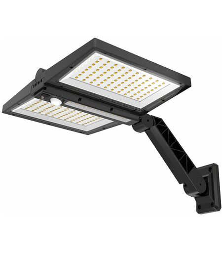 CARATTERISTICHE: Dimensioni del prodotto: 28x18xH37cm, Classe di protezione (IP) IP44 - Colore: Nero - Numero di LED: 180LEDs - Funzioni: con rilevatore di movimento, regolabile - Tipo di spina: pannello solare - Batteria: Litio 2200mAh - Volt 3,7V - Potenza: 8,5W - Uso: esterno - Flusso luminoso: 850 LM ILLUMINAZIONE POTENTE AD ALTE PRESTAZIONI: Il faretto da parete CLIPPER BLACK a 2 teste funziona grazie al suo pannello solare integrato che raccoglie l'energia del sole durante tutto il giorno. Le sue 2 teste hanno 180 LED ultra luminosi che permettono un'illuminazione a 270°C a differenza di un faretto classico che si accende a 90°C. Il faretto solare CLIPPER BLACK è regolabile verticalmente. Con i LED che forniscono fino a 850 Lumen, questo faretto solare vi offrirà una luce super potente e luminosa quando cala la notte e in caso di movimento nella sua zona di rilevamento. È ideale per illuminare l'ingresso di un garage o di una casa, un sentiero in giardino, passaggi bui, ecc. ...