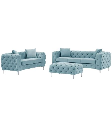 Unique Divano 3 posti, 2 posti e pouf Chesterfield in velluto azzurro pastello - EDWINA