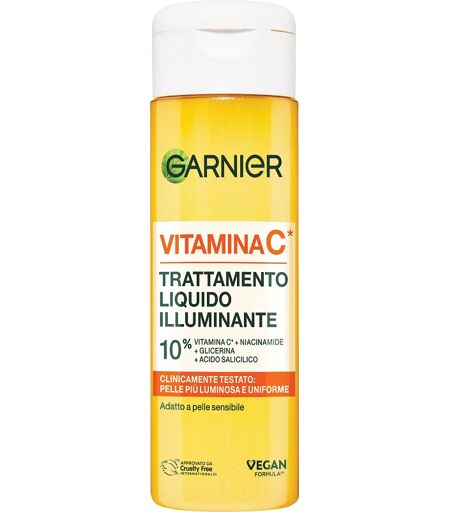 GARNIER SKIN LIQUID CARE VITAMINA C Descrizione Trattamento liquido illuminante combina [vitamina C*] e [glicerina + niacinamide + acido salicilico] per una pelle intensamente idratata e illuminata. Modalità d'uso Usare dopo la detersione e prima del siero. Applicare su un dischetto di cotone oppure direttamente con le dita. Componenti Aqua (water), caprylic/capric triglyceride, niacinamide, glycerin, propanediol, ascorbyl glucoside, phenoxyethanol, salicylic acid, pentaerythrityltetra-di-t-but yl hydroxyhydrocinnamate, xanthan gum, glyceryl stearate, PEG-100 stearate, sodium hydroxide, C14-22 alcohols, isoamyl laurate, chlorphenesin, acrylates/C10-30 alkyl acrylate crosspolymer, trisodium ethylenediamine disuccinate, parfum (fragrance), C12-20 alkyl glucoside, Citrus sinensis fruit extract/orange fruit extract, citric acid, sodium benzoate, potassium sorbate. Avvertenze Evitare il contatto diretto con gli occhi. Conservazione Validità post-apertura: 12 mesi. Formato Flacone da 120 ml. Cod. C7117200 ...