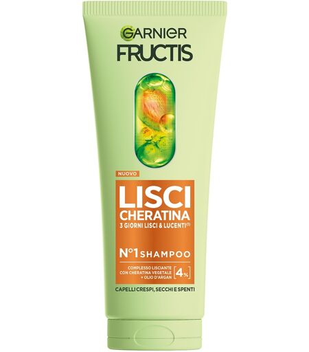 GARNIER FRUCTIS KERATIN SLEEK SHAMPOO Descrizione Shampoo con complesso lisciante con cheratina vegetale e olio d'argan che liscia immediatamente la fibra del capello. Componenti Aqua/water, sodium laureth sulfate, coco-betaine, argania spinosa kernel oil , dicaprylyl ether, PPG-5-ceteth-20, PEG-55 propylene glycol oleate, PEG-60 hydrogenated castor oil, sodium chloride, sodium hydroxide, propylene glycol, hydrolyzed corn protein, hydrolyzed soy protein, hydrolyzed wheat protein, hydroxypropyl guar hydroxypropyltrimonium chloride, citric acid, oleyl alcohol, polyquaternium-7, tocopherol, sodium benzoate, salicylic acid, phenoxyethanol, CI 14700 (red 4), CI 19140 (yellow 5), linalool, amyl cinnamal, hexyl cinnamal, benzyl alcohol, parfum (fragrance). Avvertenze In caso di contatto con gli occhi risciacquare immediatamente e abbondantemente. Conservazione Validità post-apertura: 12 mesi. Formato Tubetto da 200 ml. Cod. C7151900 ...