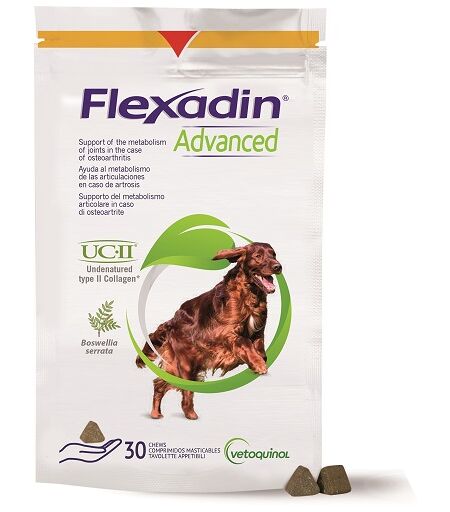 Flexadin Advanced - Descrizione Tavolette appetibili per cani per il supporto del metabolismo articolare in caso di osteoartrite. Contiene: UC - II (40mg/tavoletta appetibile), con collagene di tipo II non denaturato. Il collagene di tipo II è un importante componente della cartilagine. Boswellia s… ...