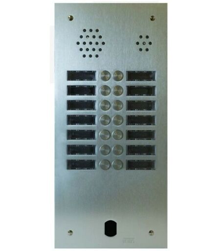 Finitura: alluminio. Parte anteriore in mm (AxLxP): 385 x 180 x 6 mm. Installazione in mm (AxLxP): 374 x 160 x 57 mm. Indice di protezione: IP53/IK08. Blocco audio ed estensione 16 bp montati e cablati. Targa audio citofonica a 2 file da 14 tasti. Per sistema a 2 voci. ...