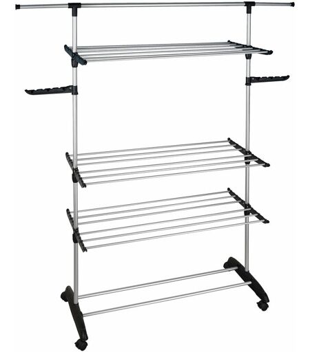 Stendibiancheria multifunzionale di grande capacità, completamente regolabile, pratico grazie alle sue grucce integrate! Appendi fino a 25 m di biancheria (equivalente a 3 macchine) su 3 livelli! Ideale per famiglie numerose. Dotato di 2 grucce, una barra di estensione per appendere lenzuola e altri oggetti ingombranti, una doppia scarpiera e 4 ruote per un facile movimento e stabilità. Gambe extra larghe con sistema anti oscillazione. Molto compatto quando è piegato, facile da riporre. Si installa in pochi secondi. Record di 25m di capacità di sospensione. Ampio spazio tra le barre per una migliore circolazione dell'aria e un'asciugatura più rapida. Installazione facile e veloce. Piccolo ingombro. Materiale: barre d'acciaio e pali di plastica. Le sue numerose opzioni di configurazione e gli accessori intelligenti: supporto per gancio, barra di estensione, barre retrattili, ruote girevoli, lo rendono uno degli essiccatori più versatili sul mercato oggi. Dimensioni: altezza 162 cm, ...