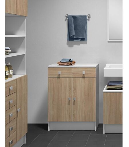 Descrizione Armadietto per il bagno in truciolare di qualità, il cartoncino risponde alla classe e1, resistente al calore, ai graffi, all'umidità e alle muffe. Mobile a due ante e due cassetti. 60x29,6x81,5 cm. Fatto in francia. Avviso di sicurezza Facile da pulire, si pulisce con un panno leggermente imbevuto di acqua. ...