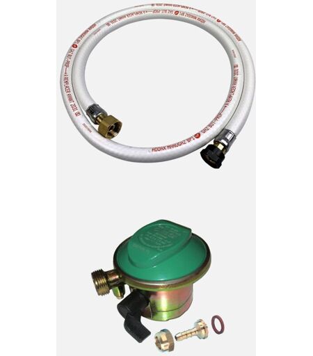 Un tubo flessibile da 1,5 m e un regolatore Quick-on Butane da 28mbar. Il tubo flessibile, con estremità meccaniche, garantisce un collegamento sicuro tra il regolatore e l'apparecchio a gas. È realizzato in elastomero rinforzato ed è valido per 10 anni (la data di validità è riportata sul tubo). La lunghezza standard del tubo è di 150 cm. Per evitare l'inversione dei collegamenti, è dotato di dadi di serraggio di colore diverso. Le guarnizioni sono incluse e già posizionate. Il regolatore fornisce uno scarico diretto e fisso della bassa pressione all'uscita dei rubinetti delle bombole di gas butano. Per sicurezza, l'alimentazione viene interrotta automaticamente in caso di disconnessione o di perdita importante. Il kit comprende anche un nipplo da utilizzare con un tubo flessibile dotato di fascetta. Tubo flessibile Pressione massima: 200mbar Attacco di ingresso: dado femmina M20x1,5 (nero, lato regolatore) Connessione di uscita: dado femmina G1/2" (oro, lato apparecchio) ...
