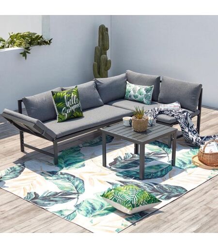 Salone da giardino basso grigio scuro con divano reclinabile Goditi il tempo trascorso nel tuo giardino o sulla tua terrazza quest'estate con questo grazioso salone da giardino basso. La sua struttura in acciaio rende questo salone molto robusto. Il divano regolabile lateralmente ti permette di trasformarlo in un sedile o in un bracciolo. Puoi inclinarlo per appoggiarti e essere in posizione lettura per rilassarti al sole. I 8 cuscini disposti sul sedile e sui poggiatesta dei divani ti assicurano un certo comfort! Le sue linee dritte e grafiche lo rendono un salone dal design moderno e pulito. Si adatterà a ogni tipo di arredamento esterno! Caratteristiche tecniche: Numero di posti: 4 Tipo di salone da giardino: Relax Colore principale: Grigio scuro Forma del tavolo: Quadrata Numero di gambe: 4 Divano reclinabile: Sì Con cuscino: Sì Numero di cuscini: 8 (6 poggiatesta, 2 sedili) Colore dei cuscini: Grigio scuro Materiale dei cuscini: Poliestere Materiale della struttura: Acciaio ...
