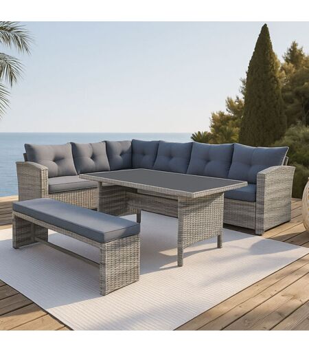 Salone da giardino 8 posti con divano d'angolo in resina intrecciata grigia Porta comfort e stile al tuo spazio esterno con questo salone da giardino per 8 persone , ideale per pranzi in famiglia o con amici. Composto da un divano d'angolo , una panca e un tavolo rettangolare , questo set è progettato per accogliere i tuoi ospiti in un'atmosfera elegante e moderna. La resina intrecciata e la struttura in acciaio garantiscono robustezza ed estetica. Il suo design pulito e il suo colore sobrio si integrano perfettamente in qualsiasi spazio esterno, dal giardino al terrazzo al balcone. Il divano d'angolo e la panca sono dotati di cuscini da 5 cm di spessore, offrendo un comfort ottimale per prolungare i momenti di relax e di pasto. Il tavolo (145 x 79 x 71 cm) è ideale per accogliere i tuoi ospiti intorno a un pasto conviviale. La sua dimensione generosa consente di condividere pasti all'aperto con semplicità, mentre il suo piano in vetro temperato facilita la pulizia e la manutenzione. ...