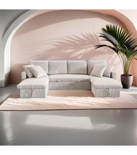 Divano panoramico trasformabile a 4 posti in velluto a coste beige con cassapanca Questo divano panoramico convertibile beige combina un'eleganza moderna con una funzionalità ingegnosa.Progettato con una struttura in legno di lino e gambe discrete, offre allo stesso tempo robustezza e raffinatezza.I suoi cuscini sfoderabili e la sospensione a molle garantiscono un comfort eccezionale per momenti di relax senza pari.Trasformabile, ha un'ampia zona notte di 267 x 110 x 44 cm, ideale per ospitare comodamente due persone.Pratico, ha due vani portaoggetti sotto i sedili, perfetti per riporre lenzuola e coperte e ottimizzare lo spazio abitativo.In grado di sostenere fino a 250 kg, questo divano si adatta perfettamente agli interni contemporanei.Facile da montare grazie a istruzioni chiare e semplici, si pulisce facilmente con un panno umido.L'equilibrio perfetto tra comfort, estetica e praticità. Specifiche tecniche Numero di posti a sedere: 4 Colore: Beige Materiale della struttura: Telaio ...