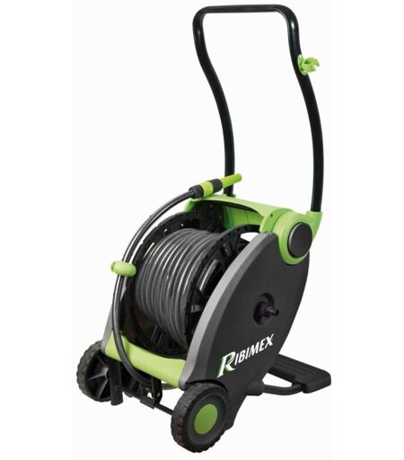 Monté sur roues. Ce dévidoir RIBIMEX allie élégance et confort d’utilisation. Doté d’un design véritablement moderne, ce dévidoir offre un grand confort d’utilisation avec un enroulement du tuyau qui s’effectue facilement et sans fatigue , grâce à la pédale située à l’arrière de l’appareil, et aux roues qui facilitent les déplacements. Structure en acier laqué avec coque en polypropylène. Poignée en métal laqué repliable. Tuyau en PVC 40 m, Ø intérieur 12,5 mm, équipé d’un raccord rapide et d’une lance d’arrosage en plastique. Butée d’arrêt du tuyau avec système d’accroche sur le tambour de tuyau. Tuyau de raccordement 2 m, équipé de raccords rapides et d’un nez de robinet 20x27 (3/4“). Poids (kg) 14.50 kg Hauteur (mm) 420 mm Longueur (mm) 590 mm Largeur (mm) 370 mm ...