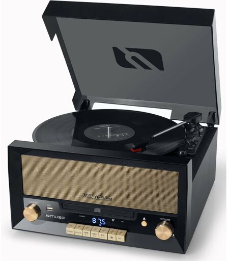 Giradischi Muse MT110B. Giradischi stereo a 3 velocità 33/45/78 giri/min. Riproduci musica in streaming da un altro dispositivo abilitato Bluetooth come laptop, tablet o smartphone. Radio FM con 39 stazioni preimpostate. Meccanismo cassetto CD. Compatibile con CD, CD-R/RW. Cassaforma in legno. Porta USB per lettura e codifica. Interruttore di accensione/spegnimento automatico. Adattatore per dischi da 45 giri. CONNESSIONI: Porta USB. Uscita RCA. Presa ausiliaria (3,5 mm). Presa per cuffie. ALIMENTAZIONE : AC: 100 - 240V, 50/60Hz. ACCESSORI : Adattatore per corrente alternata. Stilo di ricambio. PRODOTTO : Dimensioni AxPxL: 171 x 343 x 324 mm. Peso netto: 3.844 kg. Contenuto della confezione: sistema Micro CD con giradischi, adattatore per disco da 45 giri/min. ...