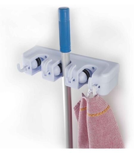 Possibilità di riporre fino a 3 scope e/o attrezzi da giardino con grande facilità. Il sistema funziona sul principio di bloccaggio dei manici (più l'attrezzo è pesante, più si blocca). Inoltre, 4 ganci pieghevoli consentono di appendere strofinacci, panni ... Colori bianco o grigio a seconda della disponibilità. Lunghezza: 28,5 cm 3 palline e 4 ganci pieghevoli . ...