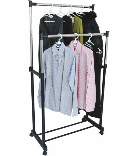 Materiale : plastica/metallo/acciaio. Colore: nero e acciaio. Descrizione prodotto: appendiabiti a rotelle con doppia barra in acciaio cromato. Regolabile in altezza. ...
