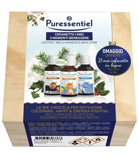 Puressentiel Cofanetto I miei 3 Momenti Benessere L'idea regalo perfetta da regalare o da provare per scoprire i benefici della diffusione. 3 mini miscele per diffusione che ti regaleranno momenti di puro benessere. È il regalo ideale per provare e creare ambienti profumati secondo i propri gusti in occasione delle Feste di fine anno. Non avrai bisogno di incartarlo, basterà infatti rimuovere l'etichetta che lo avvolge ed inserirla all'interno del cofanetto per avere un effetto sorpresa. Un piccolo gesto per il pianeta ed un'idea speciale per gli appassionati della diffusione. Il Cofanetto I miei 3 Momenti di Benessere è composto da: - 1 miscela di Oli essenziali per Diffusione Cocooning 10ml, che crea un ambiente caloroso e confrotante. - 1 miscela di Oli Essenziali per Diffusione Happy 10ml, dalle note delicatamente profumate, gioiose, fiorite, solari e dolci per regalare buonumore. - 1 miscela di Oli Essenziali per Diffusione Energia Positiva 10ml, che aiuta a ritrovare verticalità per raggiungere la perfetta armonia di mente e corpo. Approfitta appieno dei benefici e delle note aromatiche degli oli essenziali a seconda dei tuoi desideri. Cerchi un ambiente confrotante? Voglia di ritrovare il sorriso? Bisogno di fare il pieno di energie positive? Queste 3 miscele di Oli Essenziali per Diffusione sono qui per il tuo benessere ! Utilizzale con tutti i nostri Diffusori Puressentiel per godere al meglio delle loro virtù. Modalità d'uso: Da usare con un diffusore Puressentiel®. Non riscaldare eccessivamente per non distruggere i principi attivi. Seguire attentamente le istruzioni per l'uso consigliato e il parere di un professionista della salute. Non usare in presenza di bambini di meno di 1 anno. Attendere 30 minuti prima di farli rientrare nella stanza Ingredietni: Miscela di Oli Essenziali per Diffusione Cocooning Arancio Dolce, Pino Marittimo, Cannella Cassia, Pompelmo Bianco, Petit Grain Bigarade, Cannella di Ceylon. Miscela di Oli Essenziali per Diffusione Happy Ylang-ylang, Cannella di ceylon, Geranio rosato, Arancio dolce, Patchouli, Sandalo amyris. Miscela di Oli Essenziali per Diffusione Energia positiva Pino Silvestre, Menta piperita, Menta romana, Rosmarino cineolo, Salvia officinale. ...