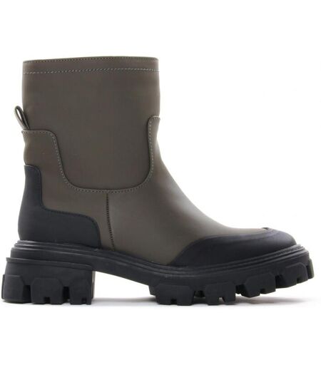 Stivali marca Vanessa Wu in verde kaki. Scarpone da pioggia influenzato dall'esercito, tomaia alta 10 cm sopra il calcio, tomaia in finta gomma color kaki con zip sul lato interno per una scarpa facile, giogo anteriore e tacco nero, suola in gomma spessa e dentellata. ...