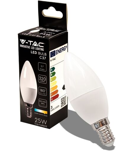 Lampada LED V-TAC 3.7W lampadinaE14, forma candela in materiale termoplastico e copertura LED SMD Opaca. Fascio luminoso di 180 e flusso luminoso di 320LM (86LM/W).Codice 214216 Tipo di attacco: E14 Tipo di LED: SMD Alimentazione: AC 220-240V, 50Hz Potenza: 3.7W Potenza (equivalente ad incandescenza): ~ 25W Colore della luce: Bianco freddo (6500K) Materiale / Copertura Lampada: Termoplastica di colore bianco con copertura LED opaca. Flusso luminoso: 320LM - 85 LM/W Apertura fascio luminoso: 180° Dimensioni: Φ37x100mm Dimmerabile: NO Consumo energetico: 3KW/1000h Vita media: 25.000h Classe energetica: F Dimmerabilità: NO CRI > 80 PF >0.4 ...