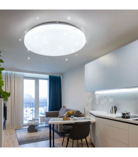 Descrizione Questa moderna lampada da soffitto colpisce per il suo design discreto e la possibilità di scegliere il colore della luce. Sotto il paralume è presente un interruttore con il quale è possibile selezionare il colore della luce desiderato (bianco caldo - 3000K, bianco neutro - 4000K, bianco freddo - 6400K). Questa funzione rende la lampada versatile e può essere integrata in quasi tutti gli spazi abitativi, ad esempio con una piacevole luce bianca calda nel soggiorno, con una luce bianca neutra in cucina o una luce bianca fredda nello studio. Un LED fisso da 36 Watt e un flusso luminoso di 3900 lumen garantiscono un'illuminazione sufficiente nello spazio abitativo prescelto. Una sorgente luminosa a LED è installata in modo permanente nella lampada. Lampada dettagli • Tipo di lampada: plafoniera • Materiale: metallo, plastica • Colore bianco • Effetto stella • Circuito CCT (3000,4000,6400K) • Grado di protezione: IP20 • Diametro x altezza in cm: 50 x 8 • Sorgente luminosa: 1x ...