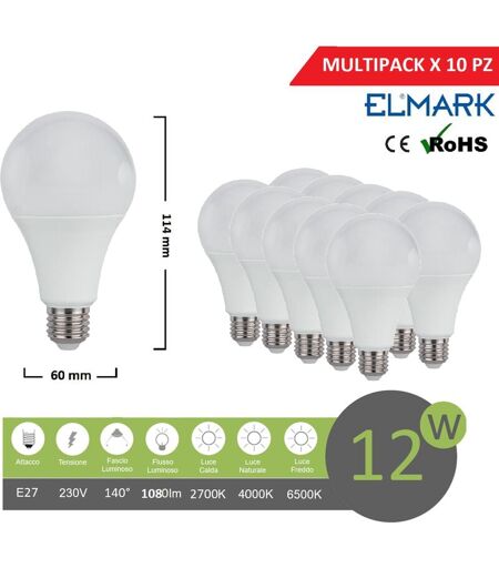 ELMARK - Promopack x 10 pz lampadina led globo A60 E27 12w attacco grande sfera basso consumo luce fredda naturale calda Naturale 4000k