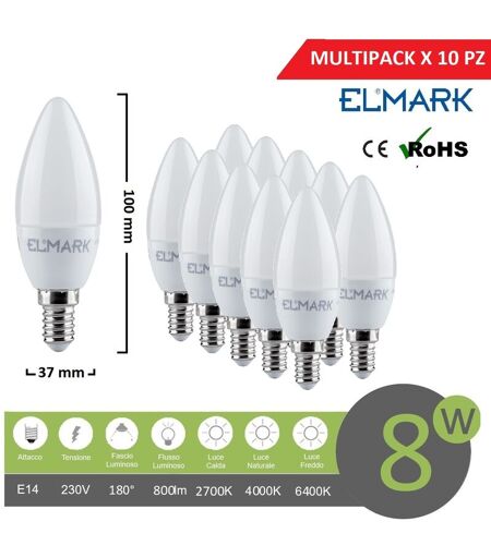 ELMARK - Promopack x 10 pz lampadina led oliva E14 8w attacco piccolo bianco basso consumo luce fredda naturale calda Calda 2700k