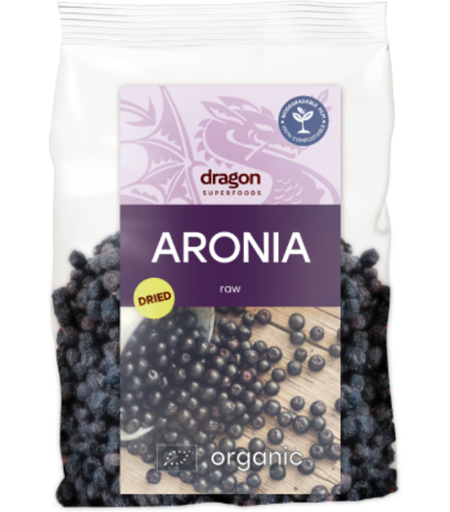 Aronia dolcemente essiccata da produzione biologica al 100 %. L'aronia (Aronia melanocarpa) è un arbusto deciduo con frutti ovvero bacche commestibili. Le bacche di aronia sono di colore viola scuro, quasi nere, motivo per cui vengono anche chiamate bacche di aronia nera. La pianta è originaria della parte orientale del Nord America e oggi è possibile trovarla anche nel nostro paese, siccome, per il suo aspetto, per la resistenza agli agenti atmosferici e per le bacche commestibili, adorna numerosi giardini. Le bacche di aronia essiccate BIO della marca Dragon Superfoods: sono ottenute da produzione biologica al 100 %, il valore nutritivo delle bacche fresche viene mantenuto durante il processo di lavorazione, possono venir usate da sole oppure mescolate a cereali, yogurt ..., possono essere utilizzate per la cottura di dolci (sono ottime, ad esempio, per la granola), sono ottime in abbinamento alla frutta secca, ad esempio con noci, mandorle, nocciole ... Le bacche di aronia sono un ideale pasto a sé stante o in aggiunta a cereali, yogurt, muesli ... ...