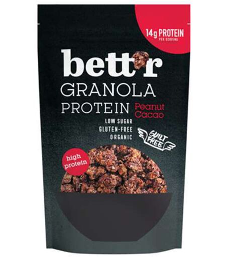 BIO granola proteica con arachidi tostate e cacao – un'ottima scelta per iniziare la giornata in modo delizioso! La granola è costituita da cornflakes cotti in forno con diversi ingredienti aggiunti come frutta secca, frutta a guscio, semi, spezie, cioccolato e simili. Alla miscela secca di ingredienti vegono aggiunti dolcificante e grasso a piacere, dopodiché la miscela risultante viene cotta in forno per legare gli ingredienti in grumi croccanti. I comuni fiocchi d'avena vengono spesso sostituiti da altri cereali, come quinoa, fiocchi di grano saraceno, amaranto e simili. La BIO granola proteica del marchio Smart Organic della linea Bettr è biologica e senza glutine, poiché è realizzata da fiocchi d'avena senza glutine. La stella degli ingredienti sono le arachidi pelate e tostate che insieme al cacao garantiscono un sapore eccezionale. Poiché tutti desideriamo che il nostro pasto sia equilibrato, alla granola vengono aggiunte anche proteine vegetali, le quali garantiscono un apporto giornaliero di ben 12 g di proteine con una porzione di questa deliziosa miscela di cereali e allo stesso tempo hanno un basso contenuto di zuccheri. Ben 12 grammi di proteine per porzione – pasto sia equilibrato. Proprio per la sua croccantezza, molte persone utilizzano la granola al posto del classico muesli a colazione, cena o spuntino – può essere gustata con yogurt, latte, consumata come spuntino o aggiunta ad altri piatti. ...