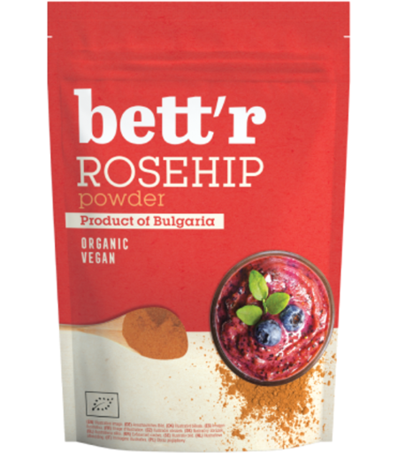 BIO Polvere di rosa canina - per aromatizzare diversi piatti e bevande. La rosa canina ( Rosa canina) è il piccolo frutto di colore rosso vivo di una pianta arbustiva della famiglia delle rosacee ( Rosaceae). Questo arbusto spinoso, che può raggiungere i 3 metri d'altezza, è conosciuto con vari nomi come rosa di macchia, spina novella, spina rossa, carampolara. Cresce soprattutto lungo i margini dei boschi, i sentieri e le aree incolte. In primavera la rosa canina sboccia con delicati fiori bianco-rosati che maturano in estate e in autunno in piccoli frutti rossi ovali. Questi frutti, ricchi di sostanze nutritive e d'altre sostanze benefiche, sono diventati da secoli un elemento indispensabile dell'erboristeria. Vengono utilizzati per produrre il tè, il succo, la marmellata, lo sciroppo e l'olio di rosa canina. Per la sua versatilità e utilità, la rosa canina è stata apprezzata da tutte le generazioni e rimane una parte importante del nostro patrimonio naturale. 100% rosa canina in polvere con alto contenuto di fibre. La BIO Rosa canina in polvere del marchio Bett'r vanta un contenuto di fibre estremamente elevato. Contiene il 100% di polvere di rosa canina, proveniente da agricoltura biologica. I frutti vengono essiccati delicatamente a una temperatura massima di 65 °C. La polvere di rosa canina ha un sapore fresco e leggermente aspro. Aggiungi 1-2 cucchiaini di polvere a succhi di frutta, frullati, cereali, yogurt, latte, dessert, ecc. ...