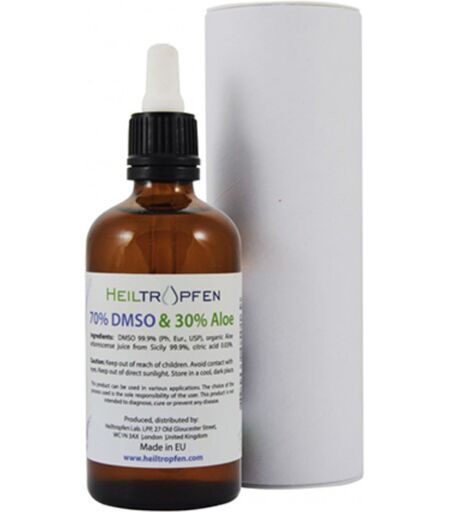 Miscela di 70 % DMSO e 30 % di succo di Aloe arborescens siciliana. Il 99,9 % DMSO ovvero dimetilsolfossido è un composto organico dello zolfo . Si tratta di un sotto-prodotto dell'industria del legno ovv. dell'industria cartiera, il quale è costituito da una sostanza presente nel legno ed è utilizzato come solvente multiuso universale dalla metà degli anni '90. È un liquido incolore che si presenta allo stato solido e liquido e la temperatura del punto di congelamento dipende dalla sua purezza. Perciò, il DMSO con una purezza del 99,9 % ha un punto di congelamento più elevato (circa 18°C), il che significa che può passare allo stato solido già a temperatura ambiente. Un altro vantaggio del DMSO è la sua capacità di essere assorbito rapidamente, il che ne facilita l'utilizzo. Confezionato in bottiglietta con una pratica pipetta per un dosaggio più facile. L'Aloe arborescens è un tipo di aloe che ha foglie più piccole e meno carnose rispetto alla sua parente aloe vera, la differenza sta anche nel loro utilizzo – l'aloe vera viene utilizzata più per la cura della pelle e per uso esterno, mentre l'aloe arborescens viene utilizzata sotto forma di preparati per uso interno. Il DMSO + succo di aloe con pipetta del marchio Heiltropfen contiene il 70 % di DMSO con una purezza del 99,9 % e il 30 % di succo di Aloe arborescens siciliana da produzione biologica. Questa straordinaria miscela è confezionata in una boccetta dotata di una pratica pipetta, che ne facilita il dosaggio e quindi l'uso. ...