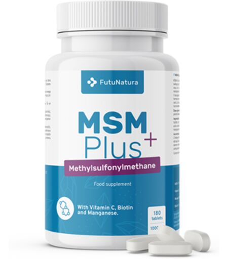 MSM Plus - le compresse per pelle, capelli e tessuto connettivo. MSM (metilsulfonilmetano) è una forma organica di zolfo naturalmente presente in tutti gli organismi viventi. Nel corpo umano si trova principalmente nella pelle, nei capelli, nelle unghie, nei muscoli e nelle ossa e inoltre è un ingrediente essenziale nella produzione di collagene e tessuto connettivo. Grazie ai suoi effetti benefici, il MSM è conosciuto anche sotto il nome "minerale della bellezza". La maggior parte dell'MSM viene ingerita con l'alimentazione, sia con la verdura sia con i cibi di origine animale, ma il trattamento termico di questi alimenti riduce notevolmente il loro contenuto di MSM. È perciò consigliato di assumerlo anche in forma di integratore alimentare. MSM Plus del marchio FutuNatura in forma delle compresse è un’ottima scelta. Inoltre del MSM, le compresse contengono anche la vitamina C, manganese e biotina (vitamina B7), grazie ai quali diventa scelta migliore sul mercato! Il minerale della bellezza MSM con la vitamina C, biotina e manganese. Le compresse MSM Plus 1000 mg sono un’ottima scelta per chiunque desidera sostenere la pelle, rafforzare i cappelli e promuovere la formazione del tessuto connettivo. E proprio per raggiungere questi effetti, il prodotto contiene la combinazione delle vitamine e minerali accuratamente selezionata: la vitamina C svolge un ruolo nella formazione del collagene per il normale funzionamento delle ossa e della cartilagine, la biotina aiuta a mantenere capelli e pelle sani, il manganese contribuisce al mantenimento di ossa sane e svolge un ruolo nella formazione del tessuto connettivo. Il manganese e la vitamina C hanno anche un forte potere antiossidante, che svolge un ruolo importante nella protezione delle cellule dallo stress ossidativo. Lo stress ossidativo è causato da molti fattori (atmosfera, ambiente, alimentazione squilibrata…), oggi difficilmente evitabili, e le cui conseguenze si manifestano in modi diversi sull'organismo. Alto contenuto di MSM in dose giornaliera - ben 2000 mg! Il prodotto è un integratore alimentare. ...