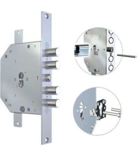 Per cilindro sagomato. Fissaggio cilindro con Sistema Simply o con vite laterale. Scrocco azionabile da chiave o maniglia. Chiusura triplice con catenaccio a 4 pistoni e 2 mandate, corsa Mm. 29, e predisposizione per chiusura aste, corsa Mm. 14. Quadro maniglia Mm. 8, interasse Mm. 72. Frontale con bordo quadro da Mm. 35x294. Scatola da Mm. 130x164. In acciaio zincato. In dotazione: 1 posizionatore, 1 distanziale e viti. ...