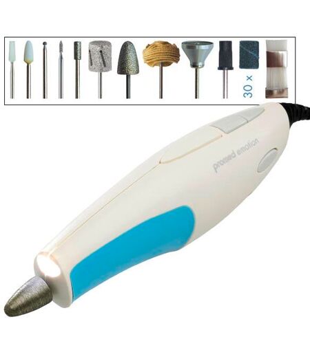 Dispositivo professionale per manicure e pedicure. Comodo funzionamento del pulsante e arresto di sicurezza. Con rotazione destra/sinistra. Include 41 accessori. Max. Velocità di 12.000 giri al minuto. Contenuti: 1 x emozione promessa10 x strumenti di molatura30 x tappi di macinazione1 x spazzola di pulizia Accessori per l'emozione promessa: 1 x cono abrasivo, zaffiro1 x punta di zaffiro, a punta1 x punta di zaffiro, rotonda1 x smerigliatrice per drenaggio corneale, grossolana -non autoclavabile-1 x punta di diamante, cilindro1 mola, zaffiro1 x cono di lucidatura, feltro1 x lucidatrice morbida, tessile1 x lucidatrice a pietra, cilindro1 x smerigliatrice a pietra, standard1 x mandrino di rettifica, plastica10 x nastri abrasivi1 x spazzola di pulizia Dati tecnici: Alimentazione: trasformatore di sicurezza 14 V, 500mA, 7 WConsumo di energia a vuoto: 0,30 WEfficienza media durante il funzionamento: 77,90Livello di efficienza: IVAlimentazione/trasformatore: 7 WGaranzia dell'unità 2 anni ...
