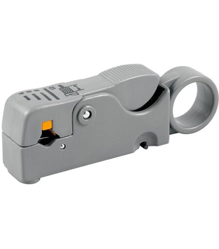 Flessibile e facile da usare: Inserire il cavo nell'utensile, chiuderlo e ruotarlo utilizzando l'anello per le dita fino a tagliare la guaina e l'isolamento/dielettrico. In questo modo il filo e l'isolamento vengono esposti separatamente in modo rapido e con poco sforzo. Le due lame di taglio possono essere regolate in modo flessibile per adattarsi a diversi diametri di cavo utilizzando la chiave in dotazione. ...