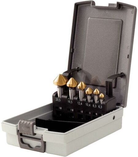 Astuccio impilabile Con chiusura integrale Cerniere molto robuste DIN 335 forma C Taglio destrorso Angolo di svasatura 90° Tre taglienti Gambo cilindrico Scanalature fresate in profondità Superficie lucida rivestita in TiN Acciaio ad alte prestazioni Ideale per sbavare e svasare acciaio, ghisa, metalli non ferrosi e metalli leggeri, nonché svasatura cilindrica senza sbavature e vibrazioni. min. Area di perforazione 6.3 Materiale da taglio HSS TiN Pezzi in set 6 Forma dell'albero zylindrisch Peso del tessuto 530 Dimensioni dell'imballaggio 1 Campo di foratura massimo 20.5 Materiale1 Hochleistungsstahl Standard DIN 335 Form C Angolo di svasatura 90 Imballaggio Kunststoffkassette Direzione di taglio rechts Area di applicazione del materiale Stahl, Guss, Bunt- und Leichtmetalle Colore gold Forma Form C Superficie TiN ...