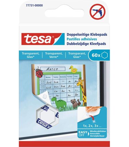 Almohadillas adhesivas Tesa de doble cara para vidrio transparente. Una forma conveniente de asegurar temporalmente artículos ligeros de papel como postales, notas y decoraciones. Rápidas y fáciles de usar, estas lindas almohadillas autoadhesivas dejarán su superficie libre de manchas pegajosas o grasosas. Son resistentes a los rayos UV e ideales para mantener decoraciones ligeras en ventanas y puertas de vidrio. Útil para tantos pequeños trabajos de montaje en la casa, Cada hogar lo necesita. ...