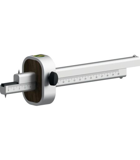 senza battuta di fine corsa · composto da 2 tratti di tracciatura di alta precisione in alluminio con scala graduata laserata · facilmente spostabili grazie alla guida scorrevole intermedia in plastica POM · punte di tracciatura in acciaio · testa di battuta in alluminio con inserti eleganti in noce ...