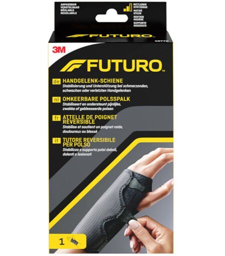 3M™ Futuro™Handgelenkschiene Die Futuro™ Handgelenkschiene bietet komfortable Unterstützung und Schutz für Ihr Handgelenk. Mit diesem Korsett können Sie mit Zuversicht durch den Tag gehen. Das Leben ist ständig in Bewegung, und das gilt auch für Sie. Die reversible FUTURO™-Handgelenkschiene bietet bequemen Schutz und Unterstützung für das Handgelenk. Mit dieser Schiene kommen Sie sicher durch den Tag. Vorteile Bietet eine bequeme, moderate Unterstützung und stabilisiert verletzte, geschwächte oder gegipste Handgelenke. Tief ausgeschnittene, ergonomische Form ermöglicht freie Handbewegung Atmungsaktive, strapazierfähige und weiche Materialien 3 Klettverschlüsse für präzisen Sitz Für rechtes oder linkes Handgelenk Latexfrei Anwendung Legen Sie die Handgelenkschiene an und achten Sie darauf, dass sie fest sitzt. ...