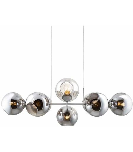 descrizione Questa lampada a sospensione regolabile in altezza è composta da una sospensione in metallo nichel opaco. Otto paralumi sferici, leggermente trasparenti, in vetro fumé sono fissati a un'asta diritta. La lampada è visibile attraverso il paralume trasparente, in modo che le lampade a incandescenza si sposino particolarmente bene con questa lampada. Grazie al suo design, questa lampada a sospensione può essere integrata in quasi tutti gli spazi abitativi con uno stile di arredamento moderno. Con una lunghezza di 100 cm e un'altezza massima di 150 cm, sta particolarmente bene sopra il tavolo in soggiorno o in sala da pranzo. Dotato di otto prese E27, puoi utilizzare lampade con una potenza massima di 40 watt ciascuna nella lampada e determinare così tu stesso il colore e l'intensità della luce. A causa della longevità e del risparmio energetico, si consiglia l'uso di lampadine a LED. Le lampadine non sono incluse nella fornitura. Particolare lampada • Tipo di lampada: lampada ...
