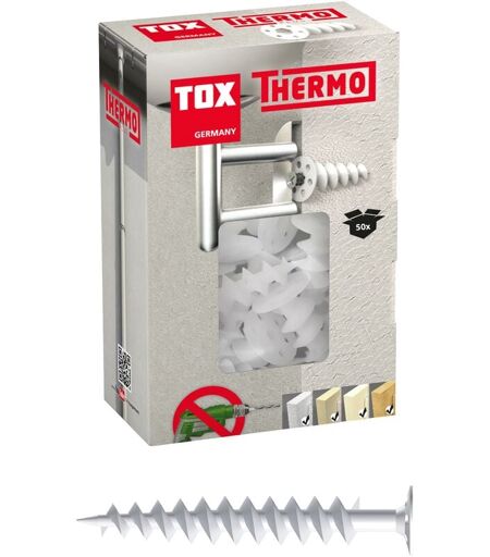 Caratteristiche e vantaggi Brevetto TOX: Lavorazione senza preforatura o utensili speciali possibili Altamente efficace nella prevenzione dei ponti termici Niente canrico di pressione sulla facciata Lavorazione rapida e carico immediato Collo di tassello rinforzato impedisce la possibile rotazione 100% nylon Descrizione e campo di applicazione Ancoraggio isolante con filettatura grossa e conica e azionamento a testa piatta TX40 Fessura per viti per pannelli truciolari Ø 4,5 - 5,0 mm Ampia gamma di lunghezze Lavorazione e montaggio Avvitare i tasselli isolanti direttamente nel sottofondo senza preforatura Preperforazione Ø 6 mm nei pannelli in fibra di legno Sigillare lo spazio anulare tra il bordo del tassello e l'intonaco con collante sigillante o acrilico verniciabile per evitare che l'acqua entri dopo la posa Montaggio non passante Altezza 22,10 Tipo di materiale PA Lunghezza della vite adatta ≤ 40mm + tfix Profondità 9,00 Quantità di contenuto 50.0 Dimensioni dell'imballaggio 1.0 ...